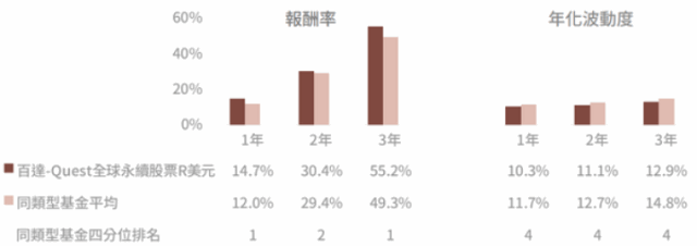 Team),其中,投資團隊有八成的成員都擁有博士學位,是一個具有學術實力與操盤經驗的專業團隊。該團隊善於運用科技來處理不同面向的因素以建構投資組合,以「3低1高」作為選股指標,加上ESG指標雙重篩選企業永續性以及財務永續性兼顧的企業,為投資人做好去蕪存菁的把關動作,精選約120檔大型優質企業。從過去1至3年的績效回溯也可發現,百達-Quest全球永續股票(基金之配息來源可能為本金)