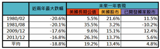 統計自1973年以來,美國公債價格經歷了4次最大波段跌幅,分別在1980年、1981年、2009年及2013年,這4次平均跌幅為18.8%。進一步細看債券在經歷最大波段跌幅後,並且持有至未來一年報酬率表現,可以發現美國長天期公債平均上漲19.2%,優於美國股市13.4%及已開發國家股市4.8%。因此市場上出現,主打「絕佳進場時機」、「債券甜蜜點」等等口號,投資人也紛紛湧入債券型基金或債券ETF卡位。