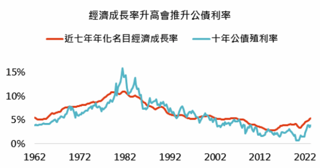 自1962年以來,觀察近七年年化名目經濟成長率,一直是影響十年期公債殖利率走勢的重要指標。美國最新公布的第三季經濟成長率4.9%,創兩年來新高,無視去年以來市場上對於經濟即將陷入衰退的警告。若美國經濟數據持續表現強勁,債券價格仍有下行空間的可能性,投資人後續須留意各項經濟數據牽動債券價格波動風險。