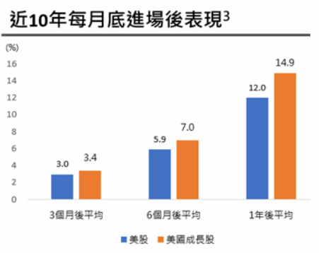 近10年美股上漲139%,表現優於其他區域國家型股市。國泰投顧統計,若於每月底進場買入美股,持有3個月、6個月及1年後的平均報酬分別為3.0%、5.9%及12.0%,其中投資於美國成長股表現尤其突出,近10年漲幅達222%,若於每月底進場3個月、6個月及1年後的平均報酬分別為3.4%、7.0%及14.9%,皆勝過整體美股表現。[3]
