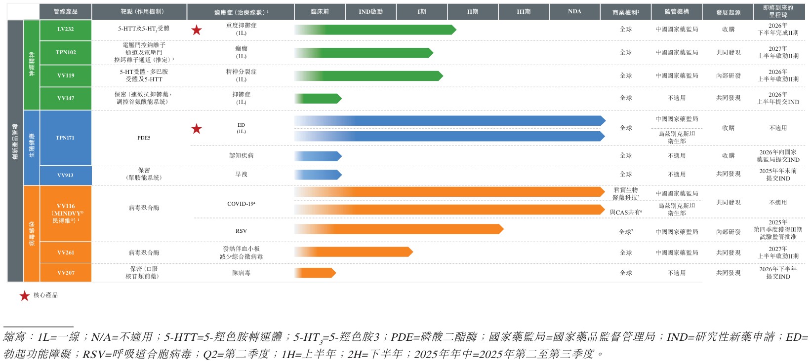 公司已獲取並開發了兩款核心產品LV232及TPN171。LV232是一款雙靶點5-羥色胺轉運體/5-羥色胺3用於治療重度抑鬱症的受體調節劑。而TPN17是一款用於治療勃起功能障礙的5型磷酸二酯酶抑制劑,已於中國及烏茲別克斯坦獲批上市。