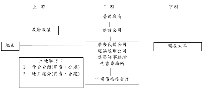 營建業上游包含土地、建材、營造業以及資金供應的金融業等;中游以建設公司為主,以及銷售的相關行業,如廣告代銷公司、建築經理等;下遊主要為一般購屋大眾和企業公司。