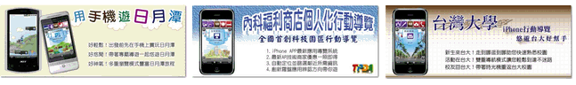 (3)行動導覽系統:代表產品包括日月潭導覽、桐花祭-隔空撲桐、台大校園導覽、廣州亞運導覽等。