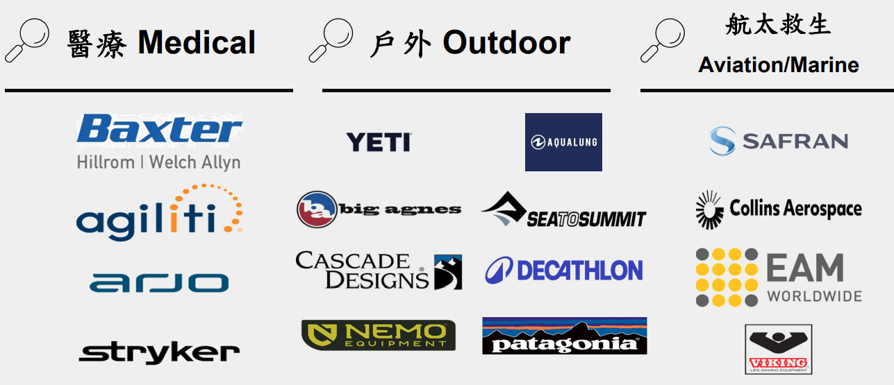主要生產為各功能別之充氣式產品,應用醫療、戶外、其他成品組件客戶。