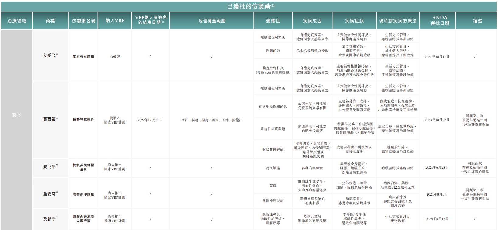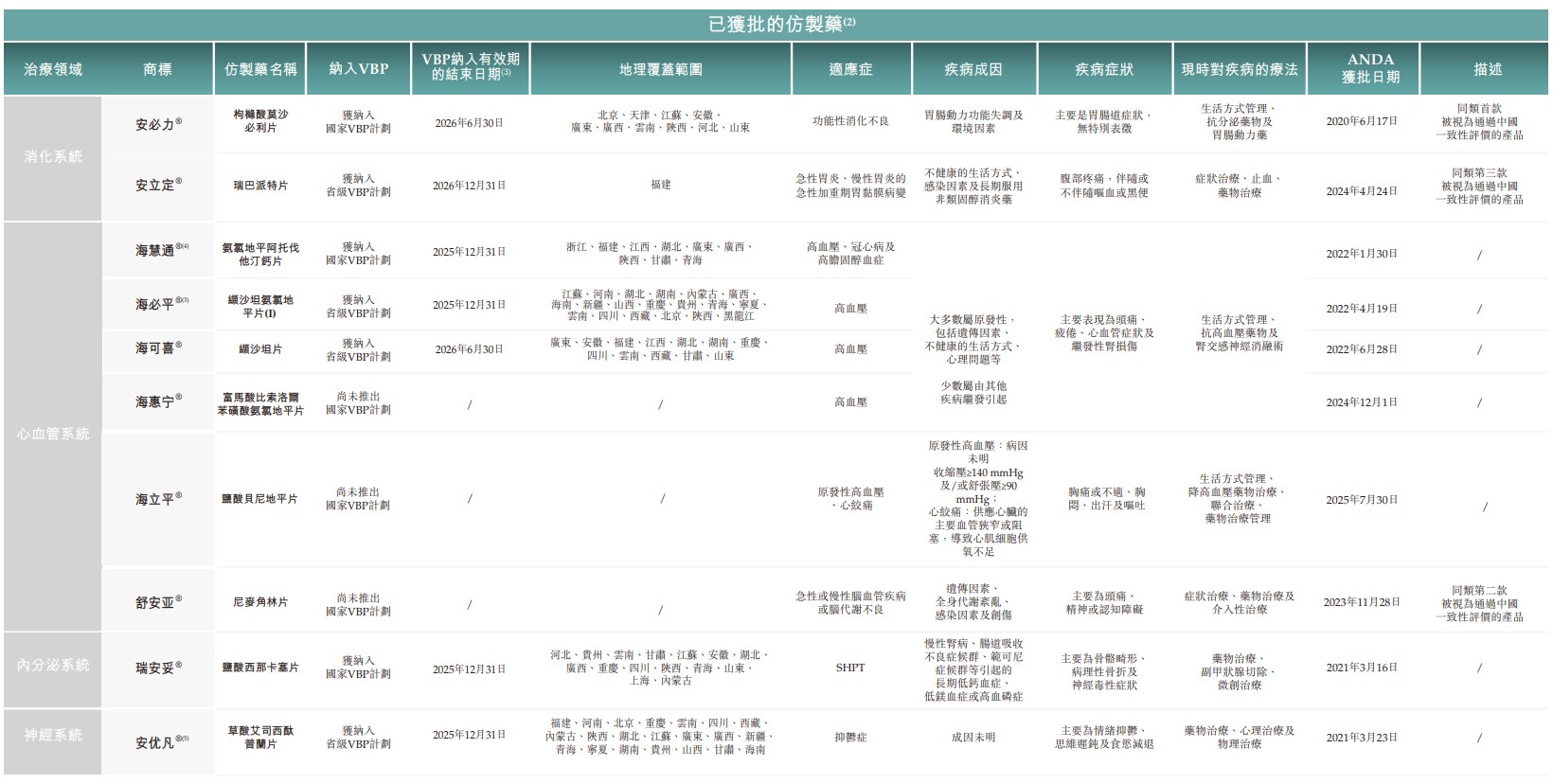 公司已商業化的產品組合主要包括用於消化系統疾病、心血管系統疾病、內分泌系統疾病、神經系統疾病及炎症疾病的仿製藥。