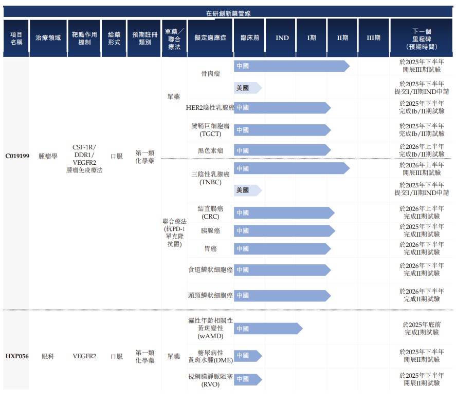 創新藥產品線專注於適應症的在研藥物,包括一款創新在研腫瘤藥物、一款潛在用於治療濕性年齡相關性黃斑變性(wAMD,因視網膜下血管異常增生所致的視網膜疾病)、糖尿病性黃斑水腫(DME,因糖尿病導致液體滲入黃斑部)、視網膜靜脈閉塞(RVO,因視網膜靜脈阻塞導致視力喪失)的首款口服藥物,及另外兩款用於治療腫瘤及呼吸系統疾病的創新在研藥物。