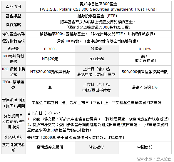 將由寶來證券投資信託股份有限公司(寶來投信)申請募集「寶來標智滬深300證券投資信託基金」,透過連結基金Feeder Fund模式連結香港掛牌的「標智滬深300基金」。交易單位是依照台灣習慣,以每千單位計價 。