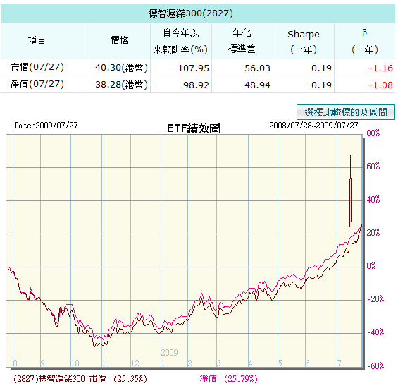 根據《FundDJ基智網》提供的資訊,2009年在中國市場強勢帶動下, 香港的滬深300ETF今年以來的報酬率截至7/27以高達107.95%。《 觀看最新資訊》