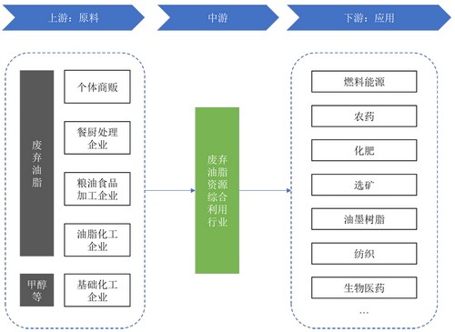 公司廢棄油脂資源綜合利用業務所用原材料主要為廢棄油脂,公司對廢棄油脂中可酯化物(脂肪酸及脂肪酸甘油酯)提純,並針對可酯化物的化學組成和結構表徵,改性合成生物柴油(脂肪酸甲酯),用作生物燃料或進一步製備為生物基材料。