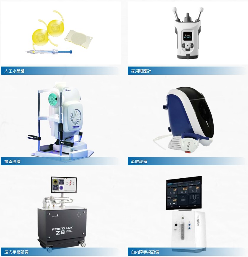 診斷設備如角膜地形圖、像差儀、裂隙燈等;手術設備涵蓋白內波超音波乳化儀、玻璃體切除儀等。 |
