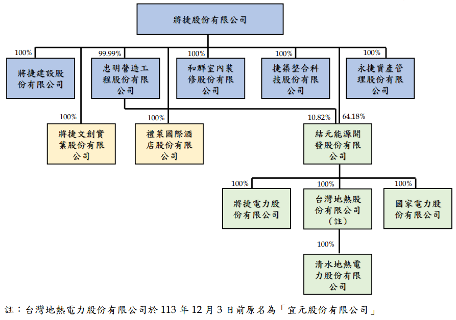 將捷建設從事土地開發、建案規劃,和群室內裝修從事景觀設計、室內裝修,捷築整合科技提供BIM技術服務,忠明營造負責集團內種類型工程發包、管理,永捷資產管理則從事不動產租賃及管理,將捷文化實業專注在飯店和商場經營,禮萊國際酒店負責餐廳的運營,結元能源開發負責地熱電廠開發,台灣地熱負責電廠的許可及申請(旗下運營的清水地熱電廠為台灣首座民營地熱發電廠),國家電力則將投入焿子坪電廠運營。