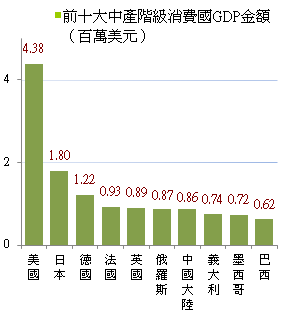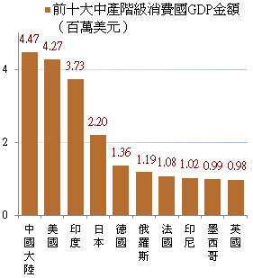 全球前十大中產階級消費國GDP排名變化分布圖 |