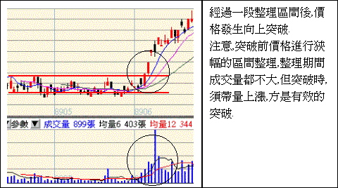 支撐及壓力將相互轉換這是相當重要的一個準則。支撐或壓力並非絕對的概念,而是相對的概念。當價格 向上對某壓力區進行突破前,將不斷的對壓力線作測試(即買盤進攻供給密集區間,並且無功而返的價格行 為,如同試探賣壓的強度),每一次測試,都將消化掉一些賣壓。因此,當價格發生突破時,代表市場在該 價位的累積需求已超過了供給,亦即突破代表市場參與者的結構發生改變,因而造成突破。在這個時候, 市場參與者的信心十足,認定原來的壓力區正是價格上漲起點,未來空間大(這正是這群人買進的理由), 因此在這個價位附近都是買點。於是,在原來的壓力區變成了需求密集區域,即支撐區。因此在當價格帶 量突破壓力區時,原來的壓力區將轉變成為支撐區。而支撐區被價格穿破後,原有的支撐將轉變成為壓力 區是相同的道理。注意!這個結構改變判定必須依靠成交量是否夠大來判定,若成交量不夠大,則不能確 定市場參與者是否夠多到足以使結構發生改變,唯有突破配合大量的成交量,才能肯定市場結構發生改變 。這也是為什麼一般人均以巨量與否來確認是否為有效的突破的道理。支撐與壓力將相互轉換的另一個原 因是投資人心理面轉變的因素。即使同一群投資人,也可能因為價格經常會回到壓力區域,而開始認為即 使在壓力區域買進,發生損失的機會也不會太高。尤其是當壓力被突破時,這種心理面的轉折將顯著的發 生,使得投資人對買進價位的設定將調整至原壓力區域,很明顯的,這個時候的壓力區已轉變成支撐了。 而支撐轉變成壓力的道理亦同。