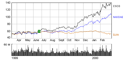 - 以CISCO而言,現本益比為129倍,First Call 估2000年EPS預估為1.02,2001年EPS預估為1.31,未來5年獲利成長率為29.5%,如回歸到原始的投資理論,顯然這個價位不太吸引人。