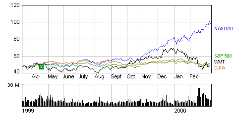- 反觀舊經濟股,在1999年裡表現不佳;(價值投資大師巴菲特是舊經濟股的擁護者,它的約克夏投資公司股價重挫4成)如果我們認為全球經濟正在復甦,代表舊經濟的成分股,獲利應會緩步攀升,股價沒有理由反而下挫,顯然舊經濟股的股價有低估之嫌。