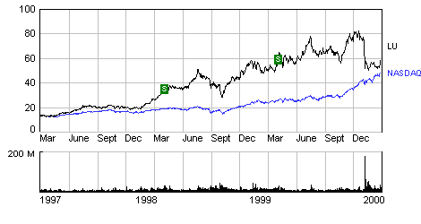 公元2000年預估EPS為1.39,2001年預估為1.70;華爾街分析師預期Lucent未來5年盈餘年均成長率為23.6%;Lucent2000/3/3的收盤價為71美元,P/E為51.6,總市值為226,311百萬美元。